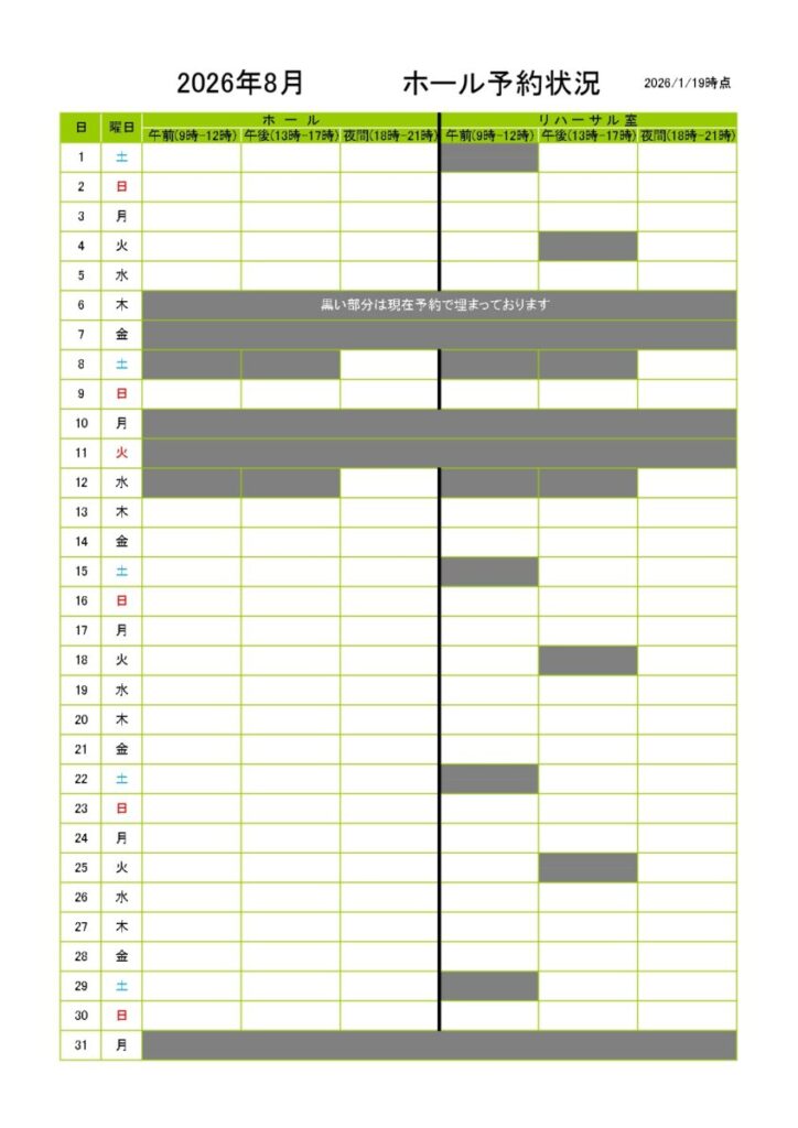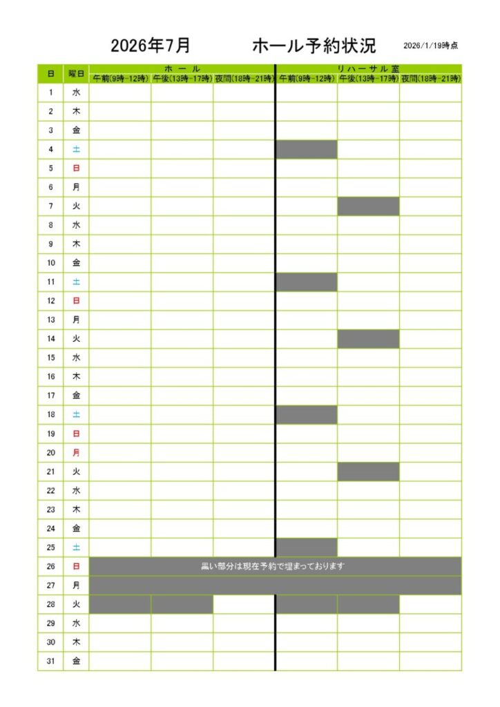 今年度の夏期ホール抽選会対象期間のホール空き状況を公開致します。