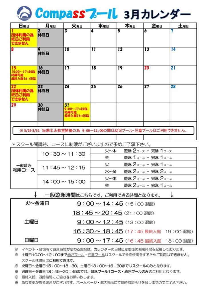 3月プールカレンダー